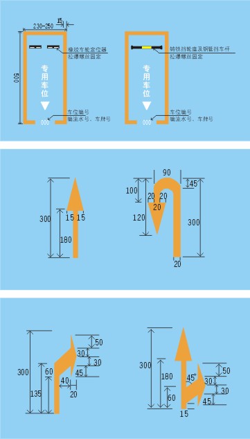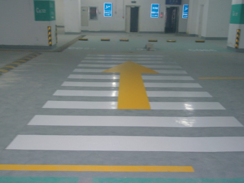 車行標志通道內(nèi)可采用黃色或白色環(huán)氧漆(可采用夜發(fā)光漆)畫箭頭進行標明車行方向及指向各停車區(qū),如A停車區(qū)、B停車區(qū)及C停車區(qū)等。